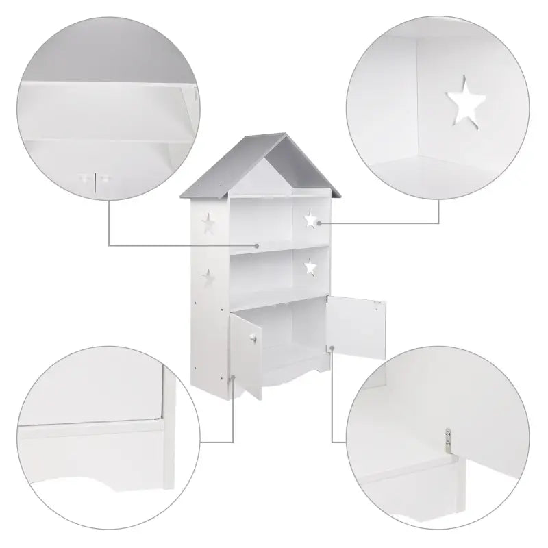 BukkitBow - Kinderboekenkast - 3 Planken en Opslagkast in Huis Vorm - Wit met Grijs - 62x115x27cm